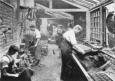 Passing the works' office and pattern shop, the latter containing several tons of casting models, we next come to the new building, a capacious structure of 80 ft. by 58 ft., of lofty elevation, and admirably lighted by roof and side windows all round. This provides accommodation for the brass finishing department, which is again sub-divided into different sections, each undertaking a distinct branch of work. Surrounding the interior are galleries 20 ft. wide, in which are placed light machinery, such as lathes, metal saw benches, and other appliances in use in brass-finishing; one end being occupied for saw-piercing, repousse, beaten, and other artistic metal work. Here we were invited to inspect some exquisite designs in elaborately wrought doorplates, knobs, handles, and other metal furnishings for builders, etc., well worthy of the world-wide repute of Wolverhampton's most artistic industries.
